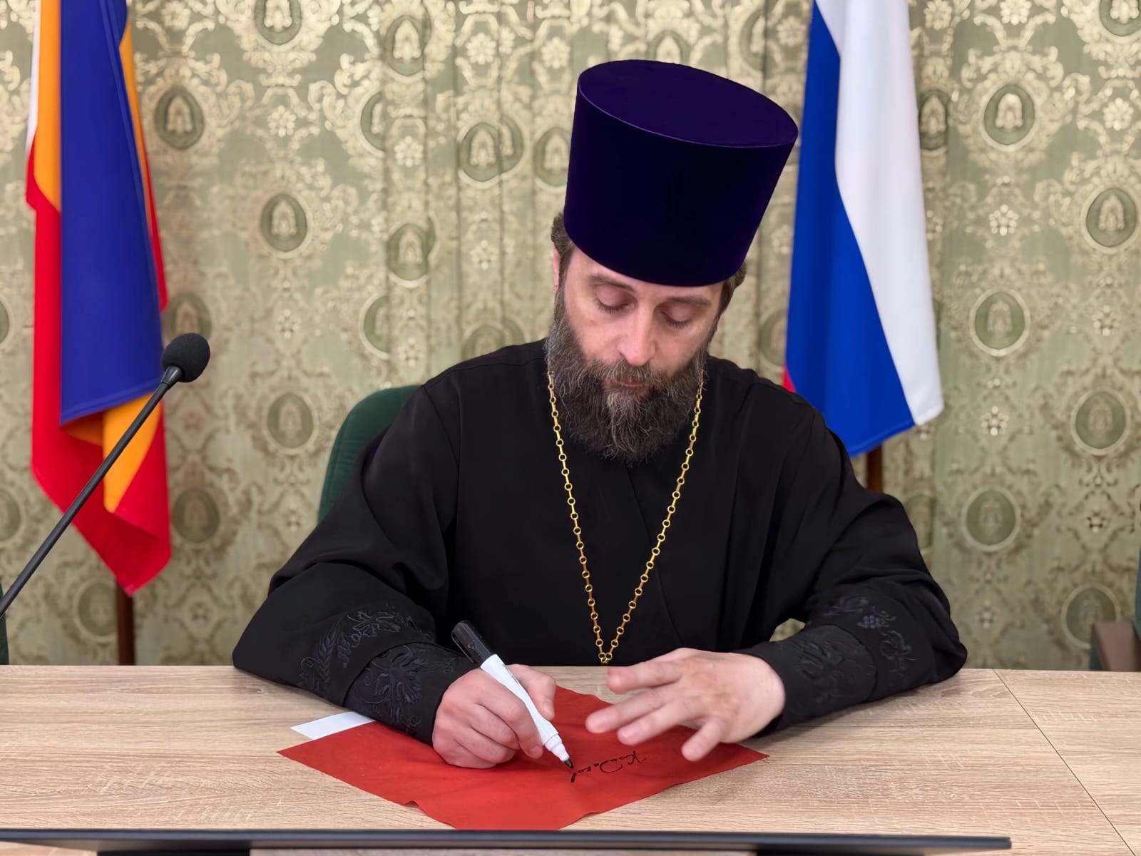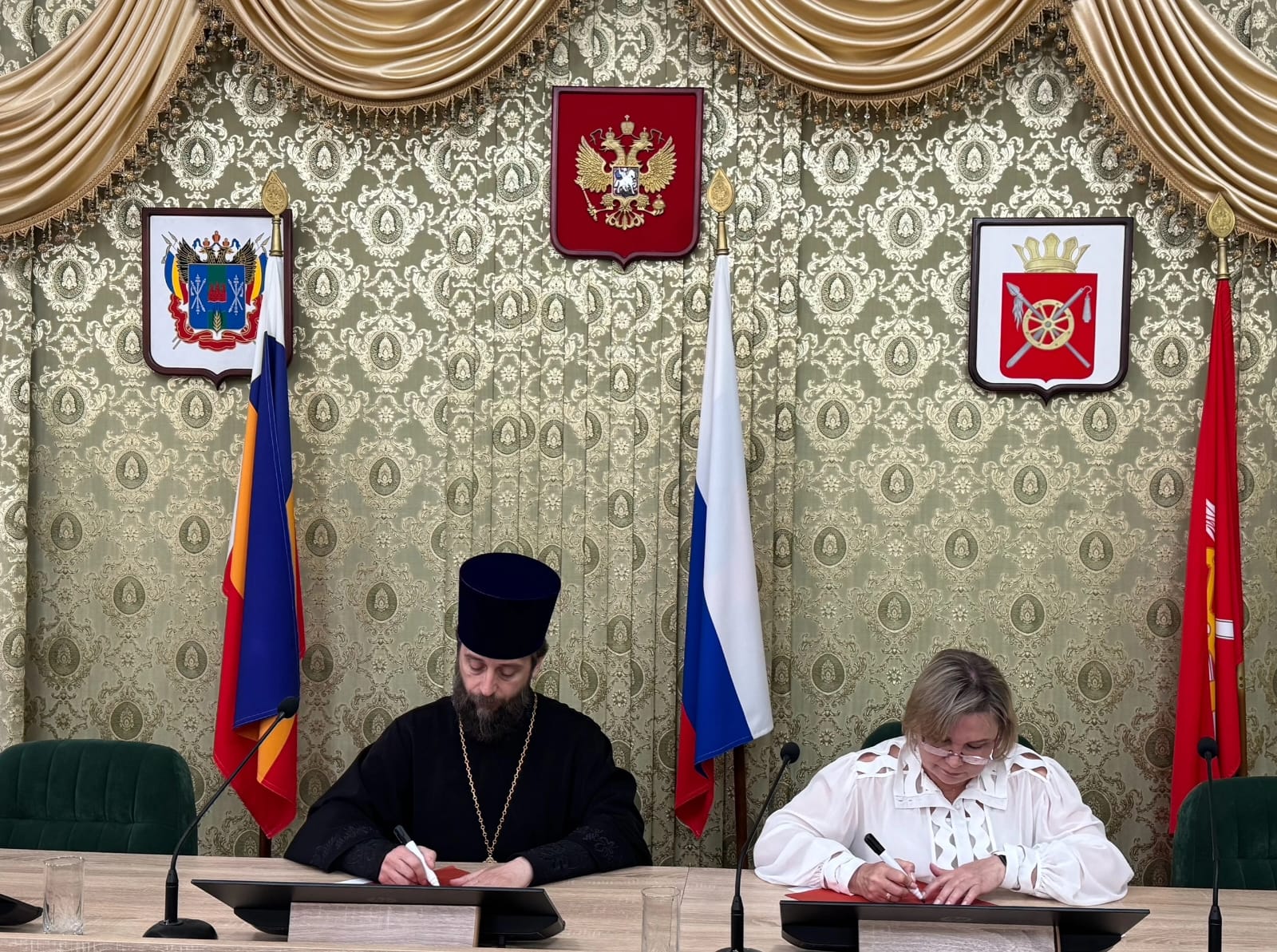 Благочинный приходов Нижнедонского округа протоиерей Сергий Яценко и начальник отдела культуры, физической культуры и спорта Администрации Октябрьского района Елена Бессарабова присоединились к региональной акции «Полотно Победы».