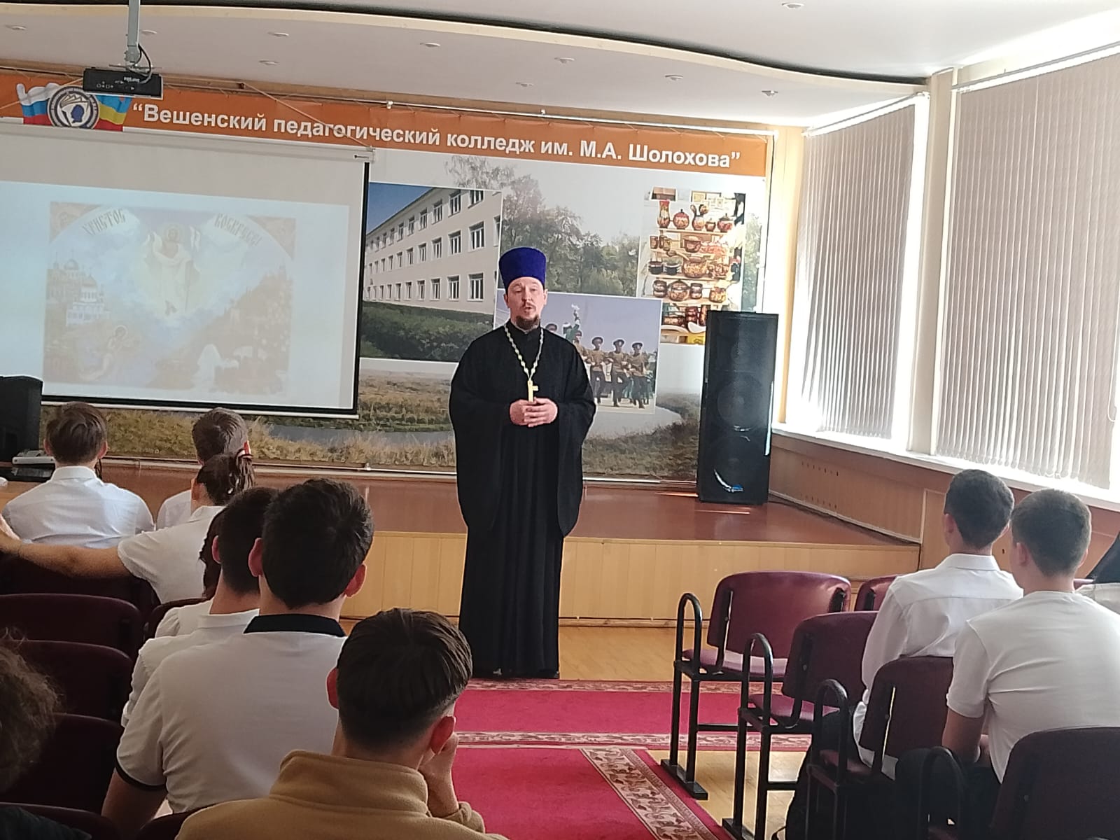 25 апреля в ГБПОУ РО «ВПК им. М.А. Шолохова» в рамках социального партнерства в воспитательной деятельности ГБПОУ РО «ВПК им. М.А. Шолохова» со Свято-Михайло-Архангельский приходом ст. Вешенской было проведено мероприятие, посвященное празднику «День Святой Пасхи». Это важный праздник для многих людей, и его празднование в колледже способствует более глубокому пониманию культуры и традиций православия.