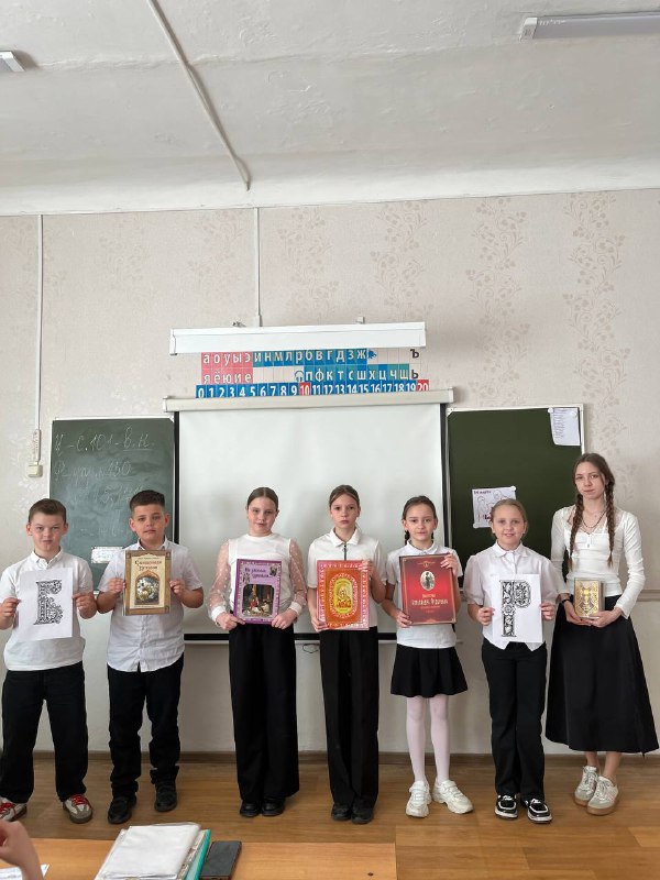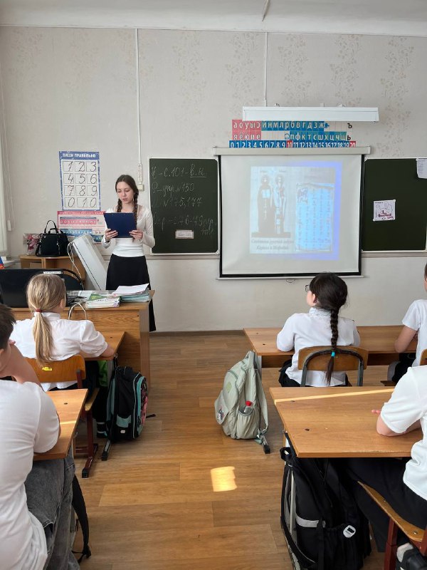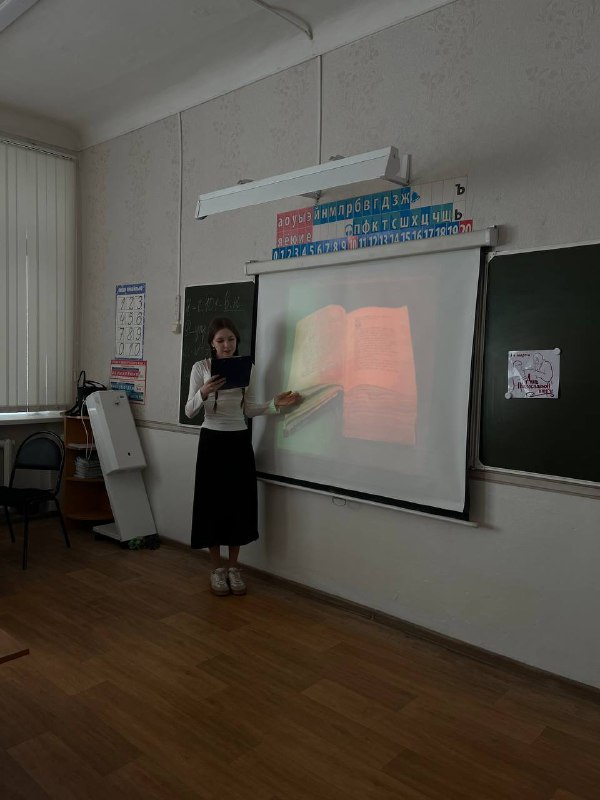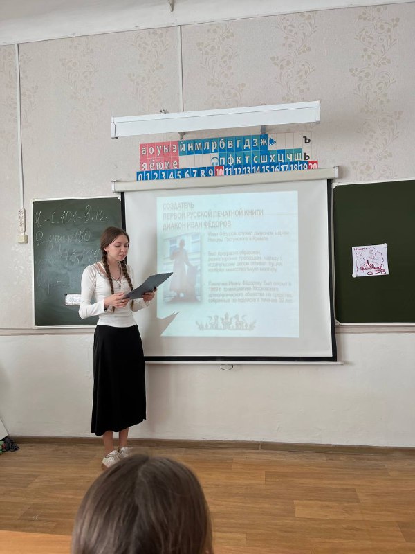 Ребята познакомились с историей праздника, узнали о возникновении первой печатной книги «Апостол» и её создателях — диаконе Иване Фёдорове и Петре Мстиславце. На слайдах презентации школьники увидели «Апостол», «Азбуку», печатный станок первопечатника и образцы старинных буквиц.