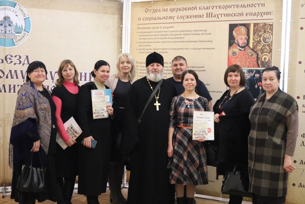 Шахтинскую епархию представили председатель отдела по церковной благотворительности и социальному служению иерей Владислав Касьянов, директор детского епархиального приюта «Святая Параскева» протоиерей Александр Маликов, пресс-секретарь Шахтинской епархии иерей Александр Теличкин, заместитель руководителя отдела по церковной благотворительности и социальному служению по утверждению трезвости иерей Андрей Ковалев, председатель женсовета Шахтинской епархии Наталья Александровна Касьянова, а также представители духовенства благочиний, помощники благочинных по социальной работе и сестры милосердия.