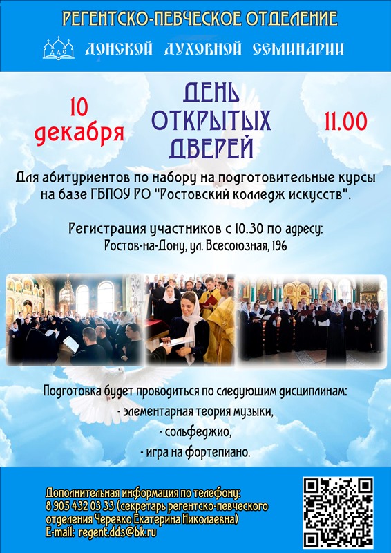 10 декабря в 11.00 в Донской духовной семинарии состоится День открытых дверей для абитуриентов по набору на подготовительные курсы на базе ГБПОУ РО «Ростовский колледж искусств».