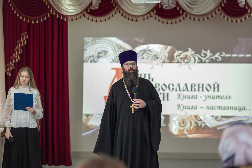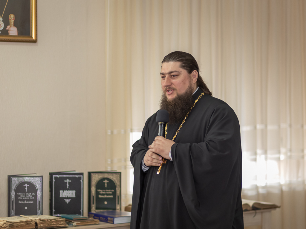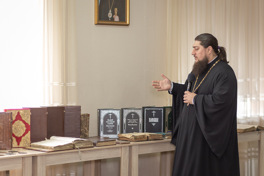 Священник рассказал о значение богослужебных и учительных книг в жизни православного христианина, печатных и рукописных книгах, виде первых печатных книг на примере репринта Острожской Библии.