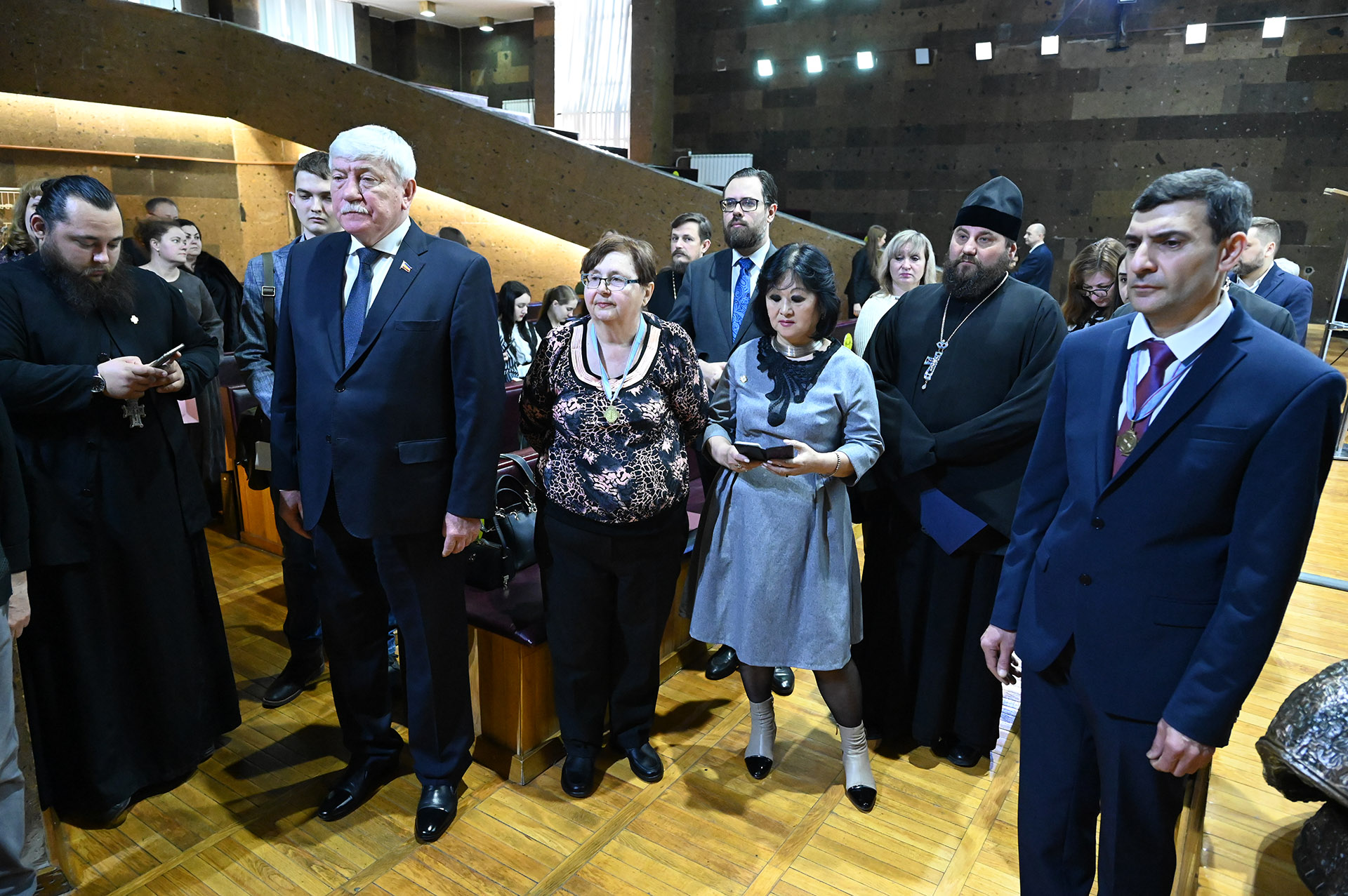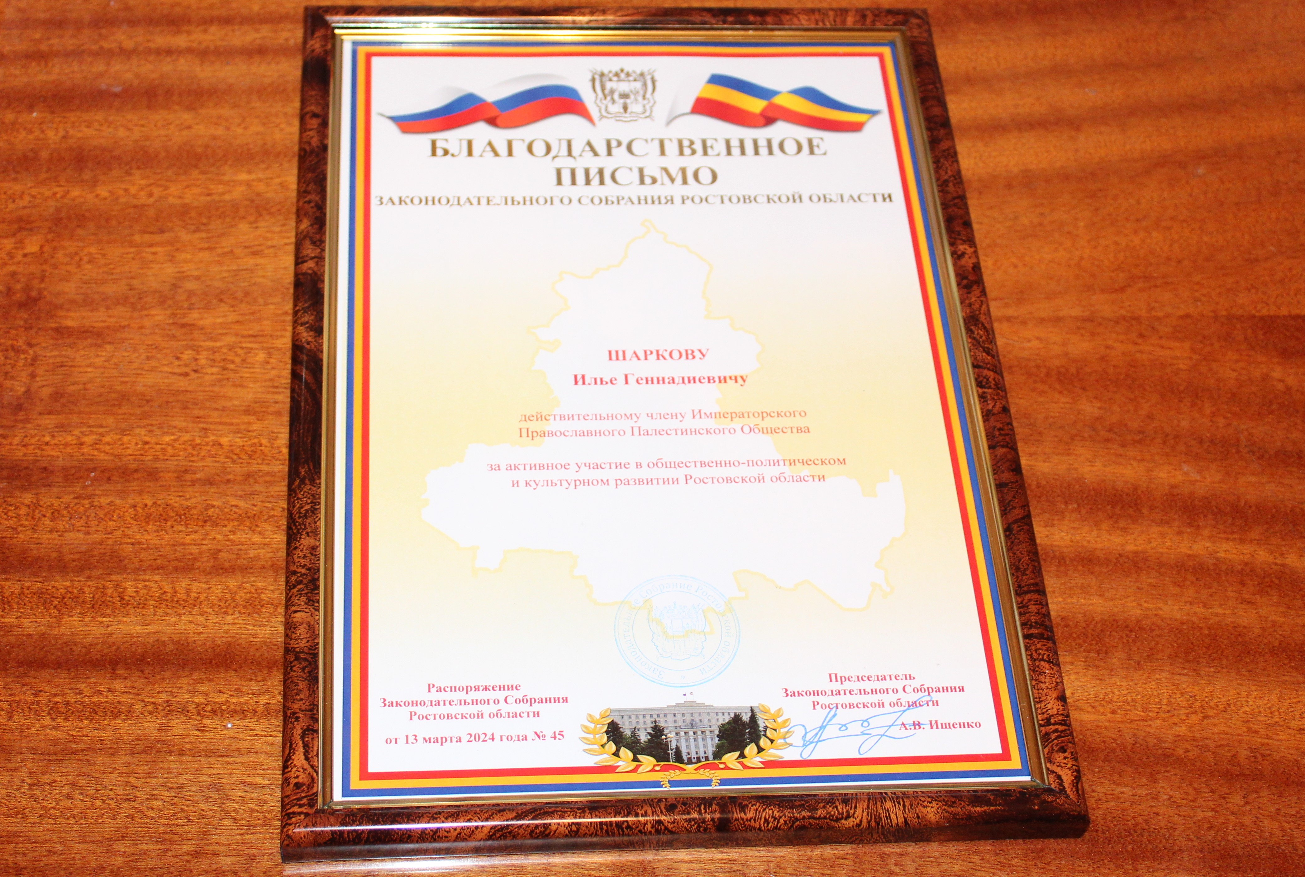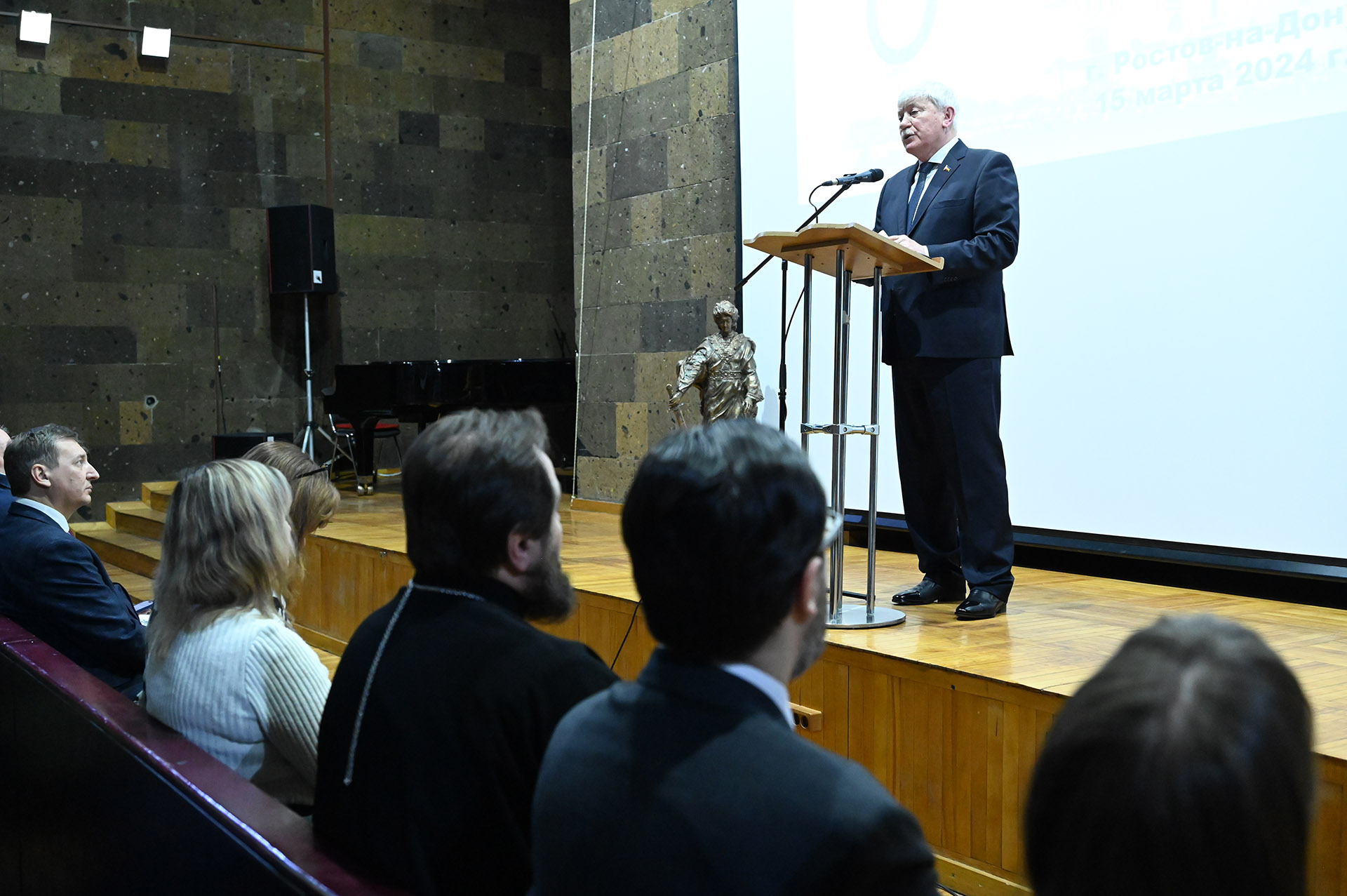 С приветственным словом к собравшимся обратился Заместитель Председателя Законодательного Собрания Ростовской области – председатель комитета по аграрной политике, природопользованию, земельным отношениям и делам казачества Вячеслав Николаевич Василенко, отметивший важность подобных форумов, значимость для региона памяти архиепископа Афанасия (Пархомовича), просветительской деятельности донского духовенства и Императорского Православного Палестинского Общества в прошлом и настоящем. Он подчеркнул, что православная вера является одним из основных столпов российской государственности. И сегодня, в очень непростое для нашей страны время многократно возрастает значение укрепления национального единства: – «Каждому человеку, чтобы преодолевать трудности, необходима духовная и нравственная основа, и ярким примером такого человека, который не просто шёл по праведному пути, но и вел за собой многотысячную паству явился Архиепископ Донской и Новочеркасский Афанасий. Именно он открыл в Новочеркасске отделение Императорского Православного Палестинского Общества, которое стало надежным проводником донских верующих на Святую Землю». Вице-спикер донского парламента поблагодарил Ростовское отделение ИППО за вклад в сохранение единства, работу по православному просвещению, развитию духовного наследия, паломничества и религиозного туризма. Вячеслав Николаевич отметил, что настоящий форум продолжил тематику первых Палестинских чтений в городе Шахты, проведённых в сентябре 2022 года и собравших большое число заинтересованных участников. Затем В. Н. Василенко вручил Благодарственные письма Законодательного Собрания Ростовской области действительным членам ИППО: скульптору, Заслуженному художнику РФ, почётному члену Российской академии художеств Сергею Михайловичу Исакову и Учёному секретарю Ростовского регионального отделения ИППО, старшему преподавателю ИСОиП (филиала) ДГТУ в г. Шахты, древлехранителю Шахтинской епархии Илье Геннадиевичу Шаркову.