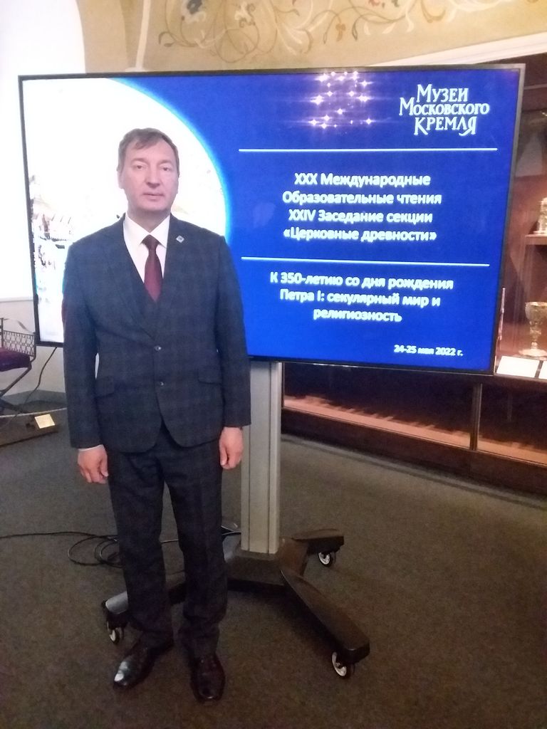 В рамках секции «Церковные древности» XXX Международных образовательных чтений 24-25 мая 2022 г. в Патриаршем дворце Московского Кремля (Мироваренной палате) состоялась научная конференция «Церковные древности. Московский Кремль. К 350-летию со дня рождения Петра I: секулярный мир и религиозность». Форум возглавили епископ Рыбинский и Романово-Борисоглебский Вениамин, заместитель генерального директора Музеев Московского Кремля по научной работе, доктор искусствоведения Андрей Леонидович Баталов и начальник управления гуманитарных наук Российского фонда фундаментальных исследований (РФФИ), доктор филологических наук Василий Петрович Гребенюк, выступив с приветственными словами.