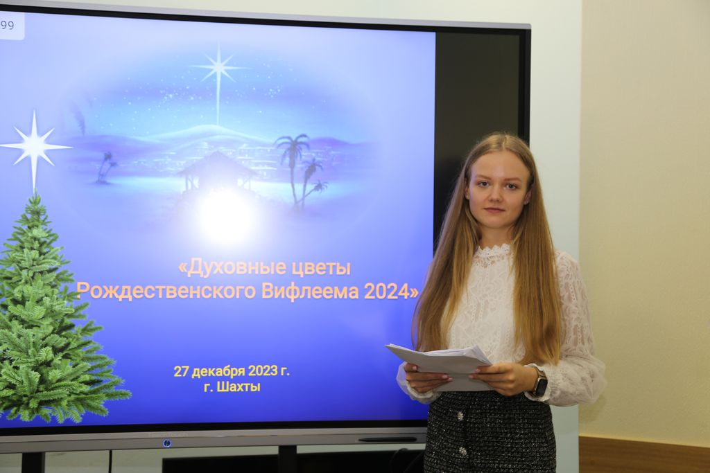 Ведущая проекта студентка Шахтинского музыкального колледжа Владислава Соловьёва призвала собравшихся в празднично украшенном зале в преддверии великого христианского праздника, особенно любимого в нашей стране – Рождества Христова, – погрузиться в его чудесную атмосферу, поразмышлять о праздничных традициях и проникнуться их идеями, совершить мысленное паломничество к святыням православного Востока, вдохнуть ароматы духовных цветов Рождественского Вифлеема.
