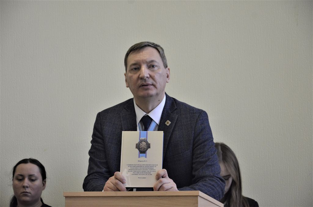 И. Г. Шарков представил собравшимся вышедшую в рамках реализации проекта по гранту Российского центра научной информации авторскую монографию «Социокультурная, просветительская и организационная деятельность отделов и уполномоченных Императорского Православного Палестинского Общества на Юге Российской империи в конце XIX – начале XX вв.». Вышедшая в январе 2024 года итоговая монография явилась результатом исследований, выполненных в рамках проекта-победителя конкурса на лучшие проекты фундаментальных научных исследований по теме «Россия и Ближний Восток: исторические, политические, археологические и культурные контакты и связи», проводимый совместно РФФИ и ИППО («Палестина»).Монография открывается обращениями к читателям Председателя ИППО Сергея Вадимовича Степашина и Управляющего Шахтинской епархией Преосвященнейшего епископа Шахтинского и Милеровского Симона. Автор выражает глубокую благодарность за оказанные консультации в подготовке монографии кандидату культурологии, действительному члену и члену Совета ИППО, руководителю Научной секции ИППО Сергею Юрьевичу Житенёву, а также благодарит за помощь при поиске материалов по истории Тифлисского отдела ИППО ректора Донского государственного технического университета, профессора, доктора технических наук Бесариона Чохоевича Месхи.