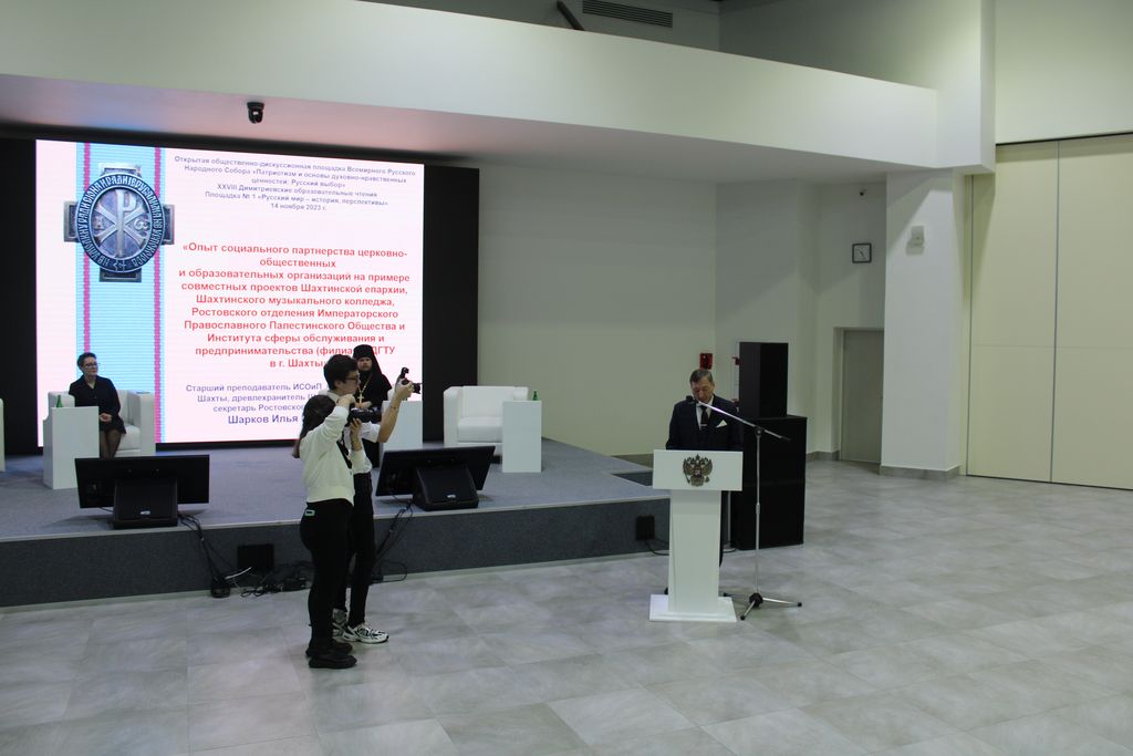 Тема иллюстрированного презентацией доклада епархиального древлехранителя и старшего преподавателя Шахтинского филиала ДГТУ И. Г. Шаркова «Опыт социального партнерства церковно-общественных и образовательных организаций на примере совместных проектов Шахтинской епархии, Шахтинского музыкального колледжа, Ростовского отделения Императорского Православного Палестинского Общества и Института сферы обслуживания и предпринимательства (филиала) ДГТУ в г. Шахты».