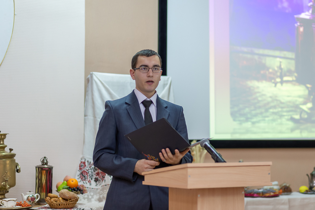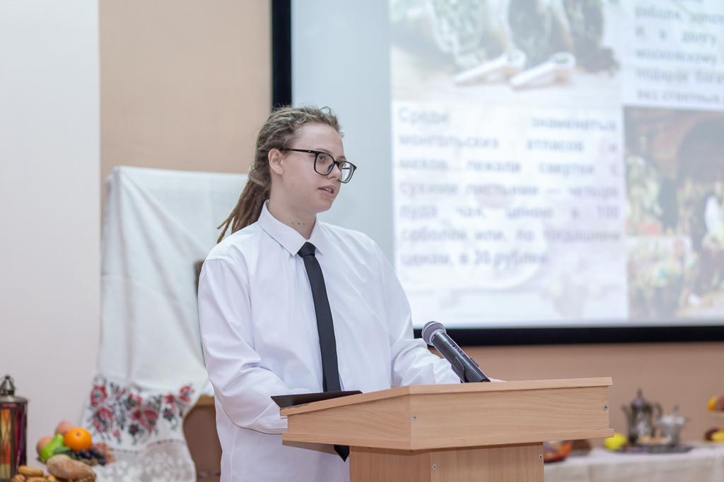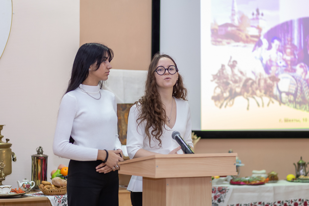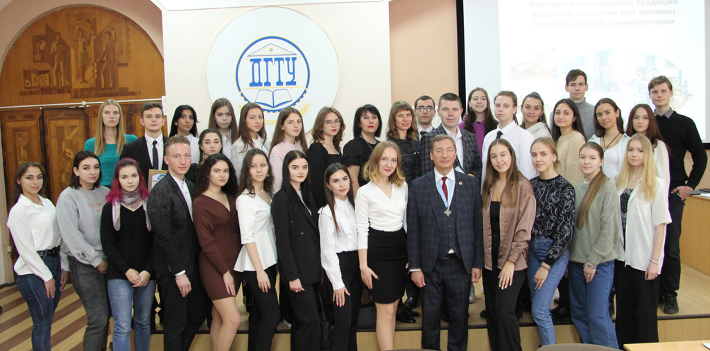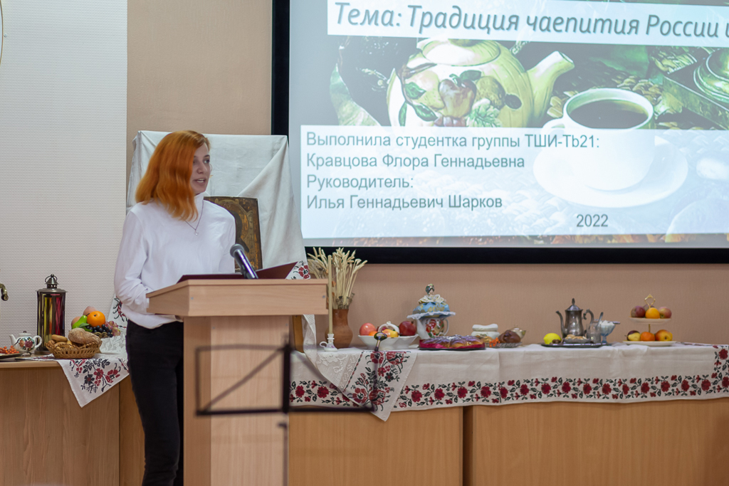 Тему чаепития как объединяющей традиции в своем выступлении раскрыла бухгалтер первой категории ИСОиП (филиала) ДГТУ Виктория Анатольевна Верецкая. Историю появления чая в России собравшимся поведала студентка ИСОиП (филиала) ДГТУ Кондратьева Лидия. О дворянском, купеческом и крестьянском отечественных чаепитиях рассказала студентка Флора Кравцова, историю самовара в мире и в России представил студент Анатолий Колодяжный. Кукла-грелка на чайник как традиционный аксессуар русского чаепития и предмет народного искусства была представлена в выступлении студентки Марии Герасимовой. Русское чаепитие в произведениях отечественной живописи стало темой доклада магистранта Натальи Прудовой. О традициях русской благотворительности на примере меценатства семьи русских кондитерских фабрикантов Абрикосовых рассказала студентка Анастасия Бондар. Все доклады и выступления сопровождались красочными презентациями. Руководитель студенческих докладов старший преподаватель И.Г. Шарков.