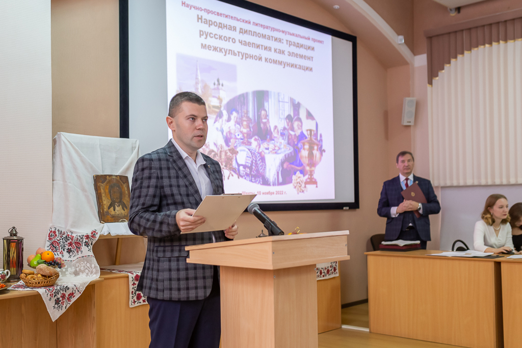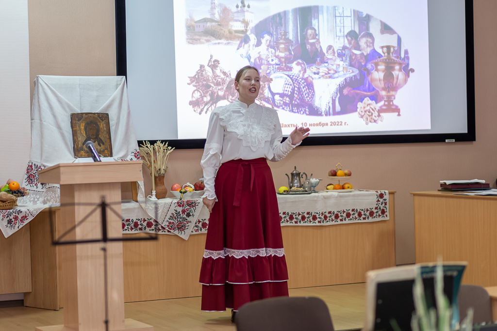 В зале заседаний Ученого совета Института сферы обслуживания и предпринимательства (филиала) ДГТУ в г. Шахты 10 ноября 2022 г. в рамках XXVII Димитриевских образовательных чтений «Глобальные вызовы современности и духовный выбор человека» состоялось просветительское мероприятие, объединившее более 60 человек. Научно-просветительский литературно-музыкальный проект «Народная дипломатия: традиции русского чаепития как элемент межкультурной коммуникации» организовали и провели Шахтинская епархия, Ростовское региональное отделение Международной общественной организации «Императорское Православное Палестинское Общество» (МОО ИППО), кафедра «Православная культура и теология» Института сферы обслуживания и предпринимательства (филиала) ДГТУ в г. Шахты, Шахтинский музыкальный колледж при поддержке Администрации г. Шахты.