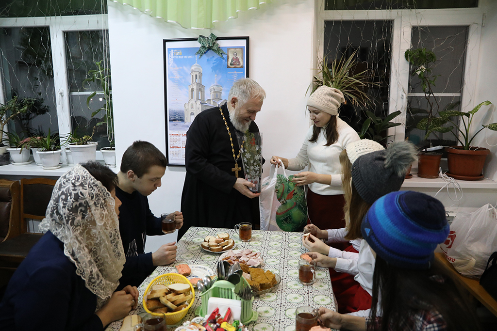 Торжество продолжилось у праздничной елки, где иерей Олег вручал подарки.