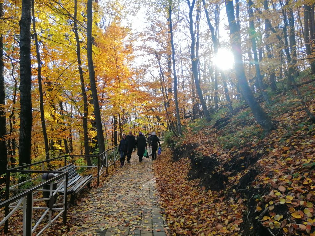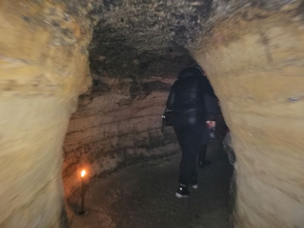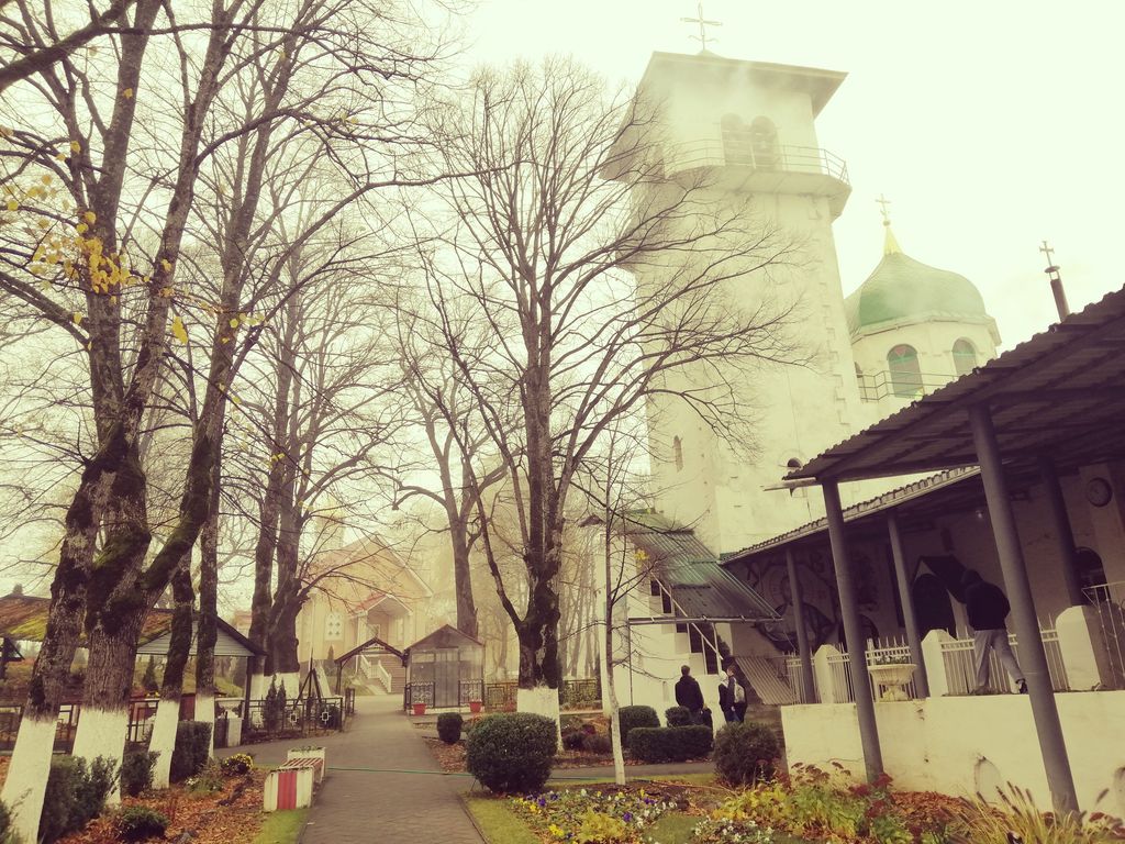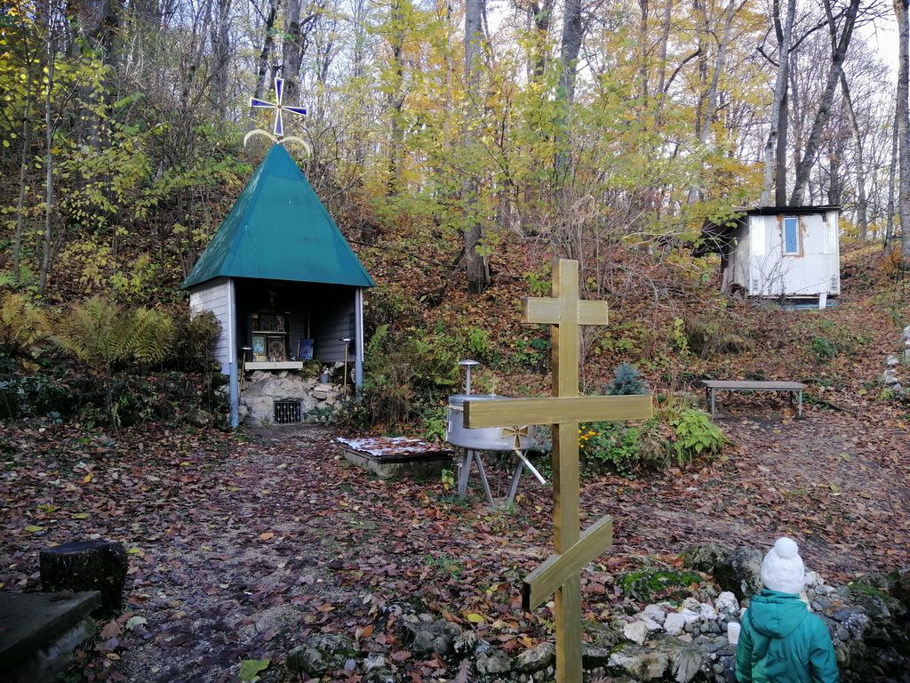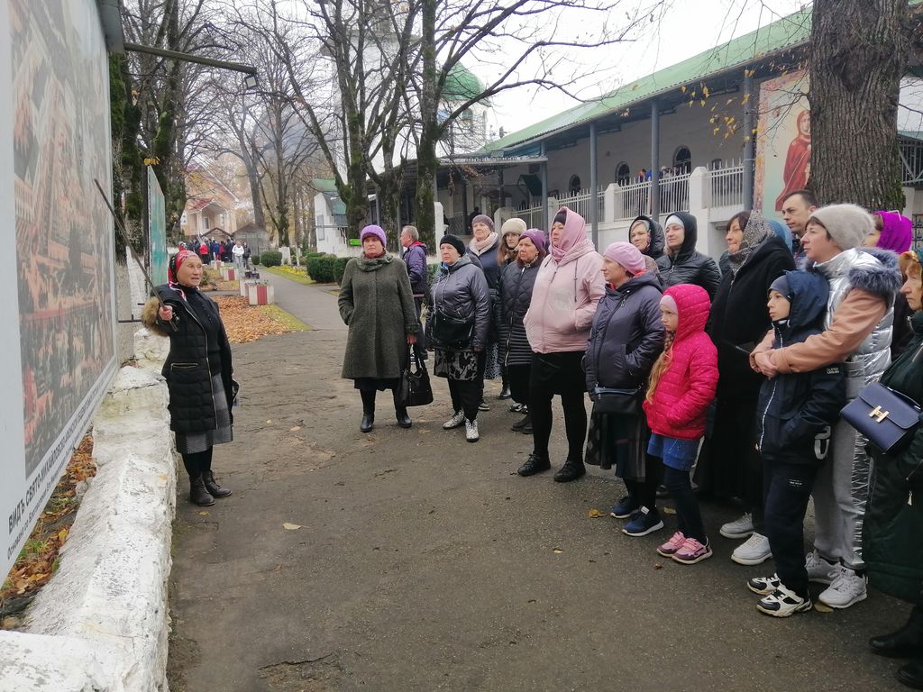 На второй день в родительскую поминальную субботу после Литургии для группы была проведена обзорная экскурсия по монастырю. Экскурсовод Ирина рассказала паломникам много сведений из истории обители. Спустились паломники и к пещерному храму, который находится в 1 км от монастыря, преодолев 289 ступенек по металлическим лестницам. Вход в пещеры низкий, чтобы зайти нужно сильно пригнуться, венчал этот длинный проход большой круглый зал, здесь был ранее пещерный храм монахов. По одной версии эти пещеры возникли в VIII-X веках и связаны с периодом Византийской иконоборческой ереси. По другой версии пещерные ходы были вырыты двумя монахами за 5 месяцев. Один из них прожил в пещере 26 лет, другой 28. Питались они всего один раз в неделю. Все время проводили в молитве, принимали приходивших к ним людей, лечили, изгоняли бесов, имея на то благодать Божью. Спали на каменных «кроватях»: в камне были выдолблены углубления не очень больших размеров. Вот на них, подстелив соломенную подстилку, они и спали. Остались углубления, где у них горели лампады и свечи. Здесь во время войны стояла икона Божией Матери, плакавшая кровавыми слезами. Вся земля вокруг иконы была пропитана кровью. При входе в пещеры экскурсовод выдала паломникам по одной маленькой свечке, которые впоследствии можно было поставить на подсвечнике в подземном храме или при желании забрать домой.