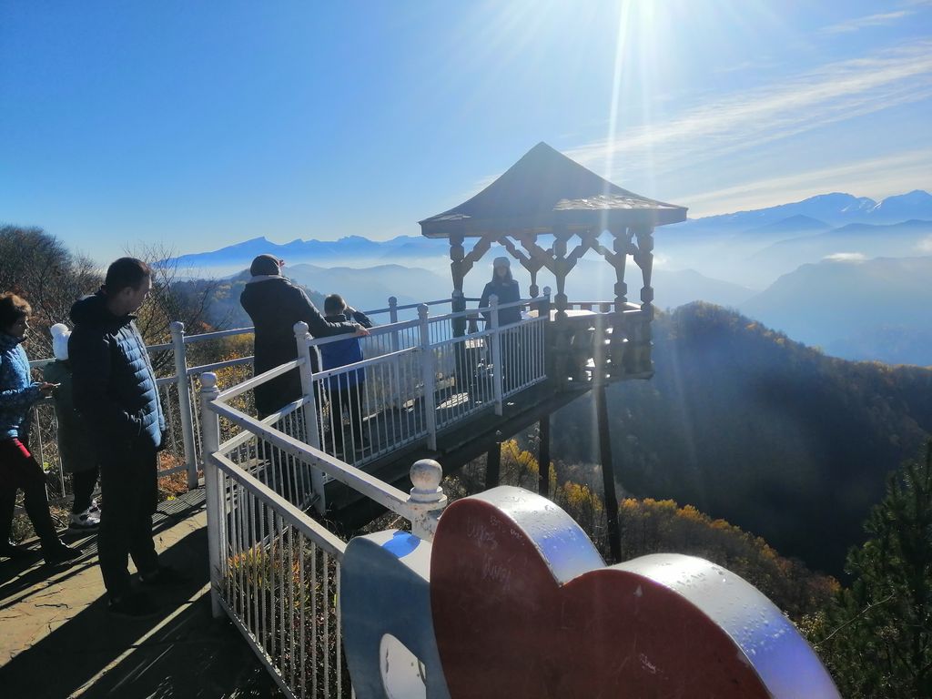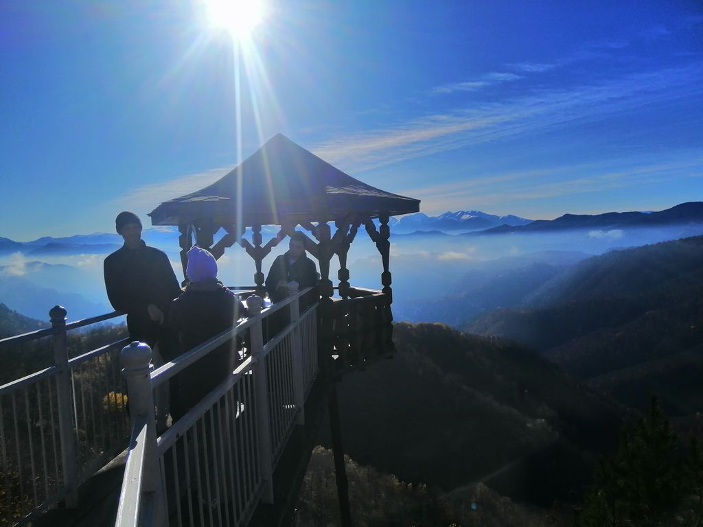 После службы участники группы поднялись на смотровую площадку, где ранее стоял храм Преображения Господня, взорванный и полностью разрушенный в 1946 году. Сейчас там находятся часовня-звонница и смотровая площадка, с которой участники поездки осмотрели окрестности и позвонили в колокола. С этих высот открывается вид к северу на горную котловину в несколько десятков верст.