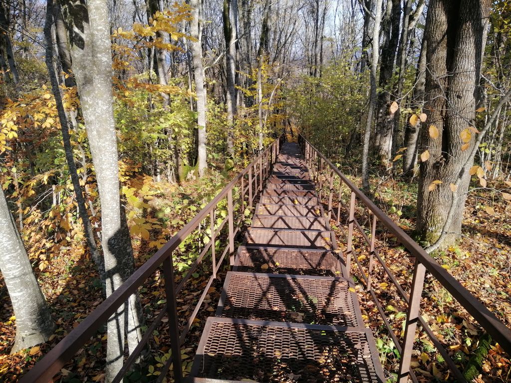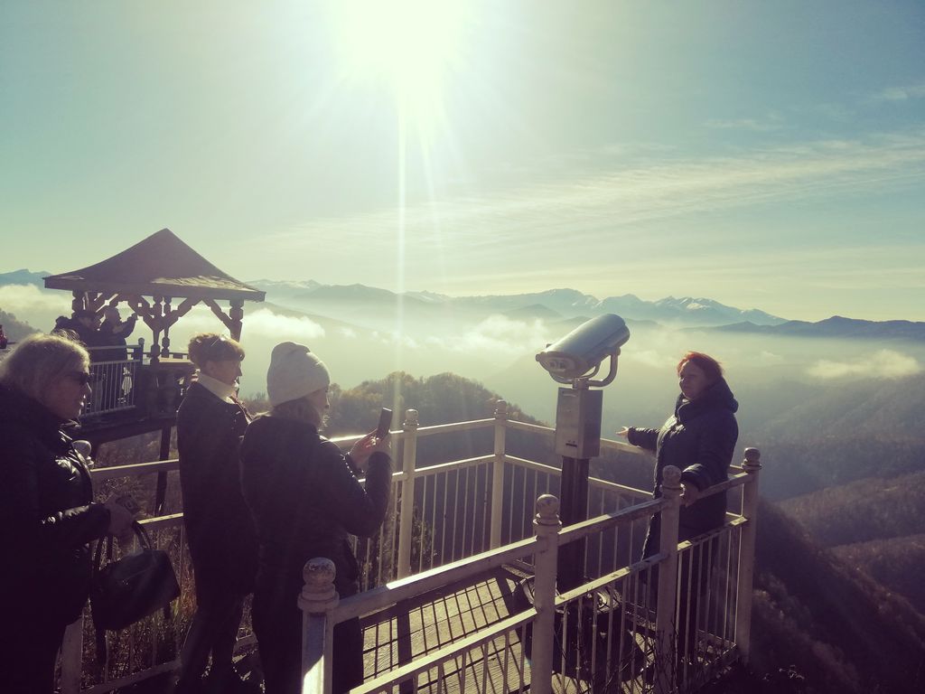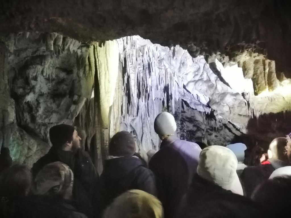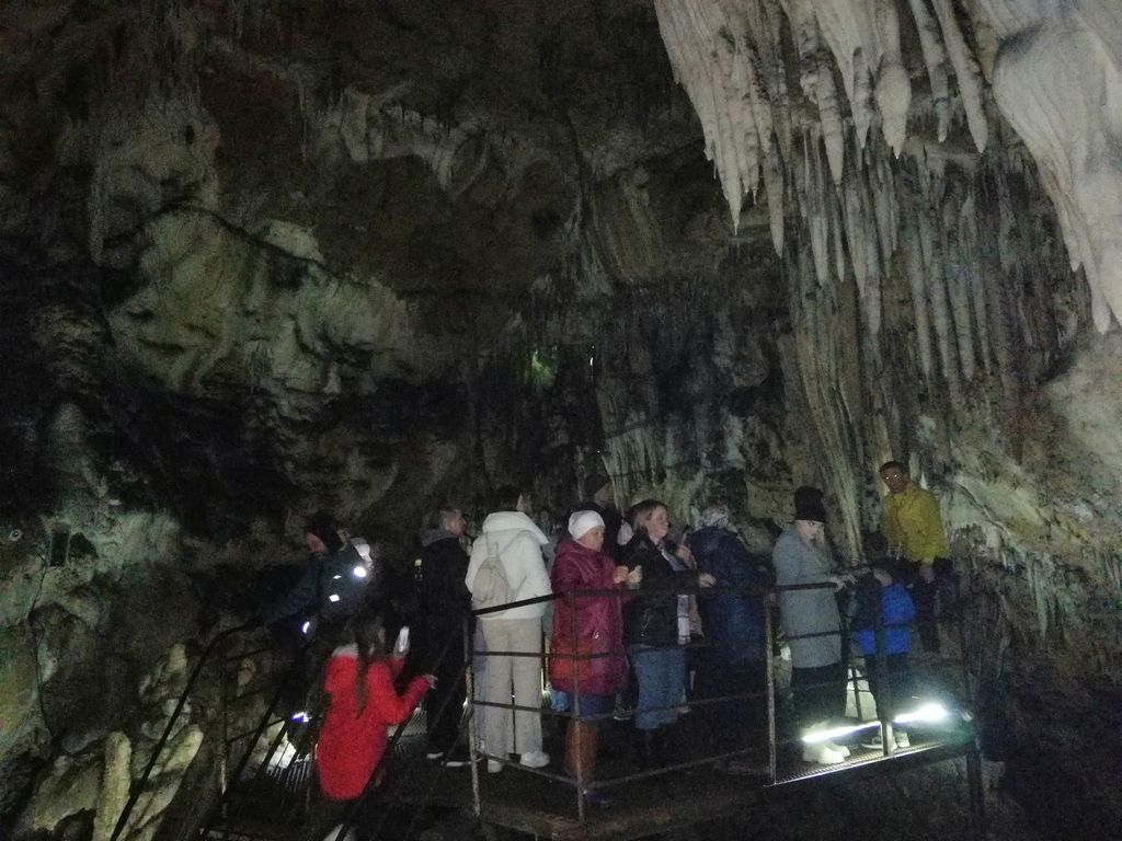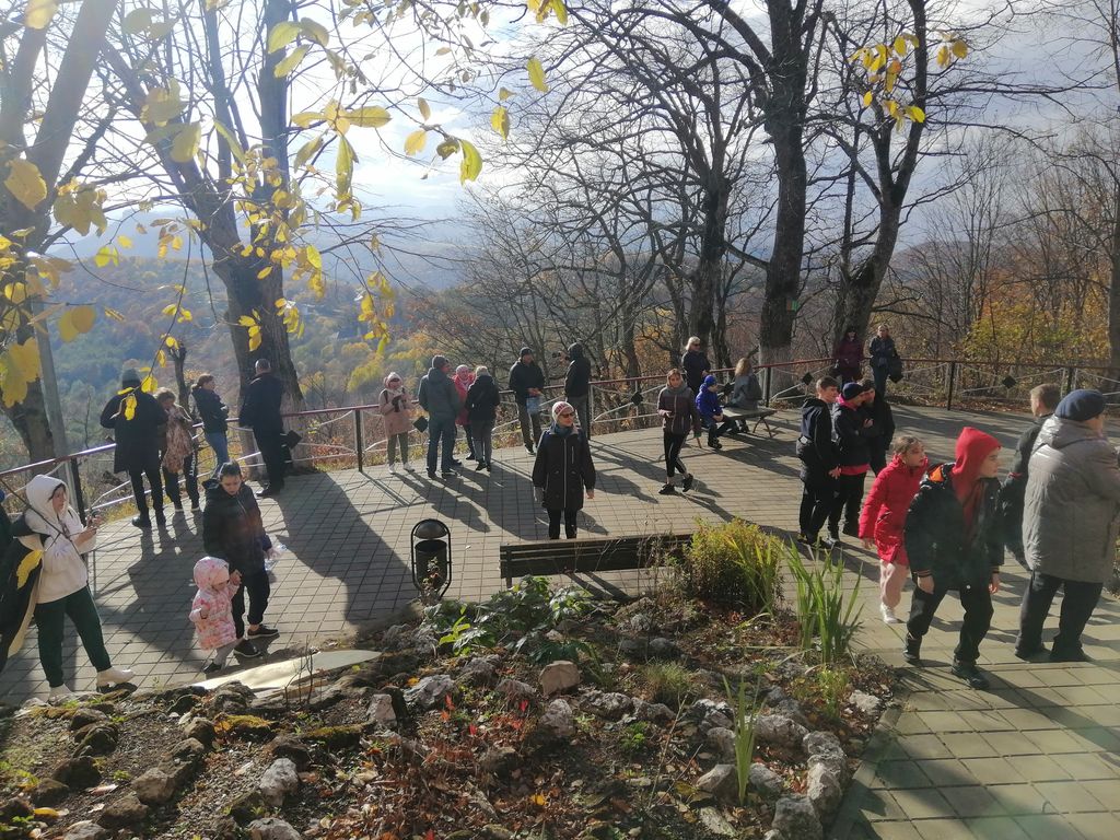 На третий день участники группы направились по горным дорогам Адыгеи в Азишскую пещеру. По пути останавливались на двух смотровых площадках и любовались открывшимся пейзажем. Очень красивы были виды на Главный и Малый Кавказские хребты, хребет Уна-Коз, высокогорное плато Лагонаки. Снежные вершины гор притягивают взгляд своей неповторимой красотой и славят их Творца. Далее паломники прибыли на место экскурсии к Азишской пещере. Спустились на глубину 20 метров, а дальность ее – 220 метров, постоянная температура здесь составляет +6,5 градусов. Удивительные сталактиты нависали над головами, не менее красивые сталагмиты росли им навстречу. И те, и другие образовывали кое-где мощные сталагнаты, 100 лет необходимо для того, чтобы они выросли всего на 1 см. Многие люди, имеющие заболевания дыхательной системы, приезжают сюда, чтобы поправить свое здоровье.