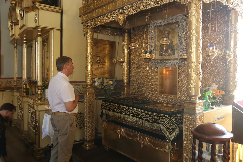 Затем паломники из Шахт направились к духовному сердцу православного Таганрога – Никольскому храму, в котором с 1999 года покоятся мощи блаженного Павла Таганрогского. Помимо раки с мощами праведного Павла Таганрогского. В храме есть образ святителя Николая Чудотворца с частицей его мощей, икона святого праведного воина – адмирала Феодора Ушакова с частицей его мощей, а также много других почитаемых образов. Никольская церковь интересна и тем, что строилась она как храм Азовской флотилии (впоследствии ставшей Черноморским флотом). А проект храма в 1777 году утверждали в Санкт-Петербурге.