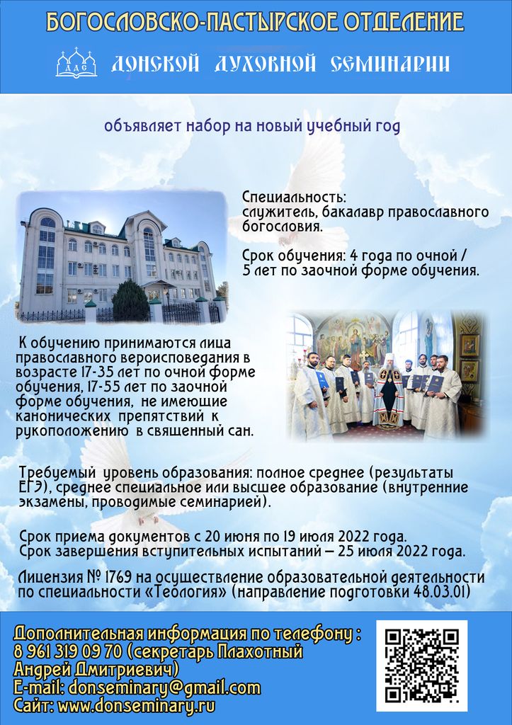 Богословские курсы. Срок обучения 2 года, по окончании выдается Свидетельство Донской духовной семинарии об окончании Богословских курсов.