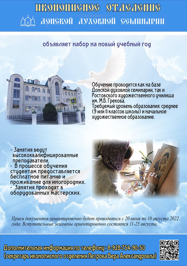 Дополнительная информация по телефону: +7 928 754 90 50, секретарь иконописного отделения Петрова Вера Александровна.