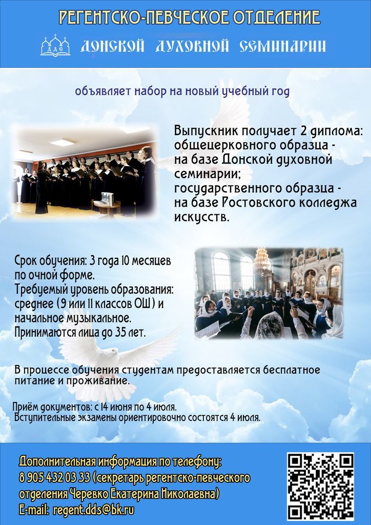 Дополнительная информация по телефону: + 7 905 432 03 33, секретарь регентско-певческого отделения Черевко Екатерина Николаевна.