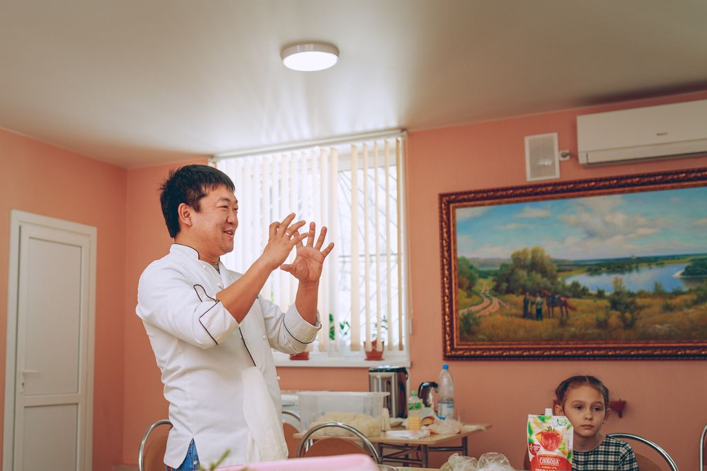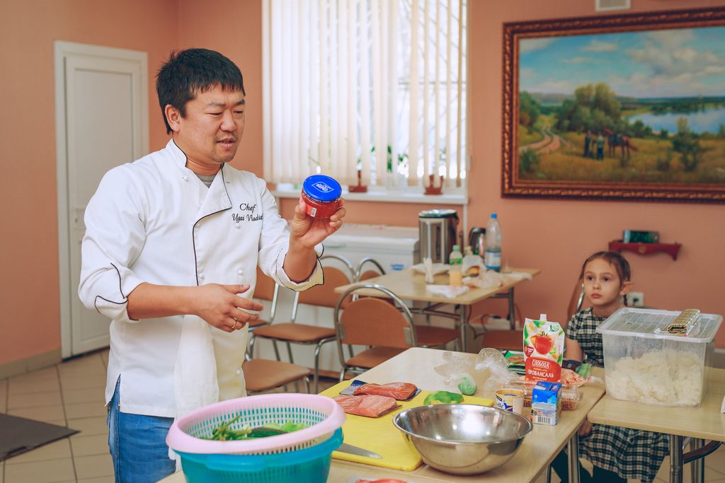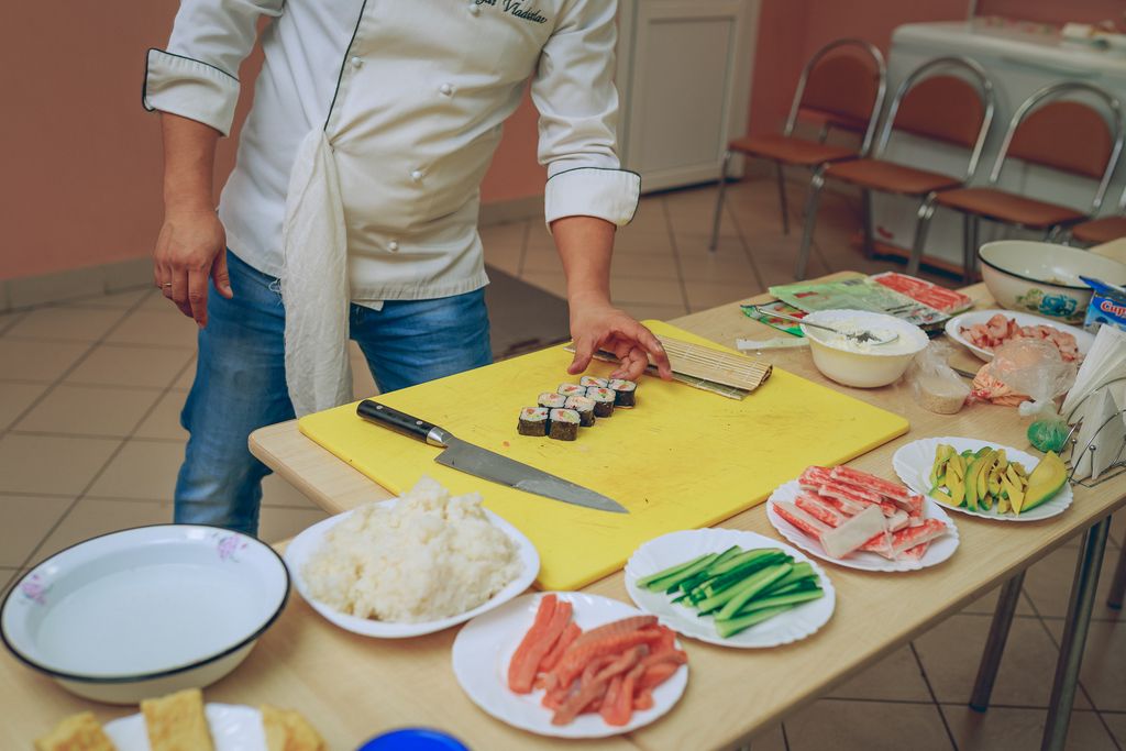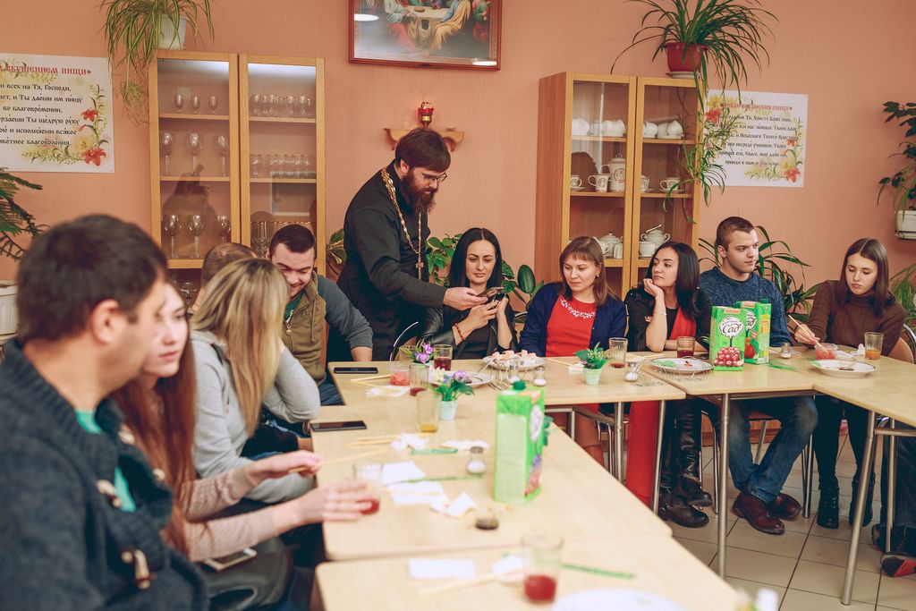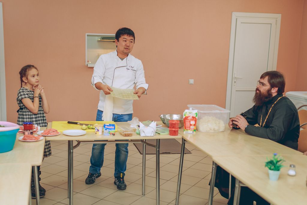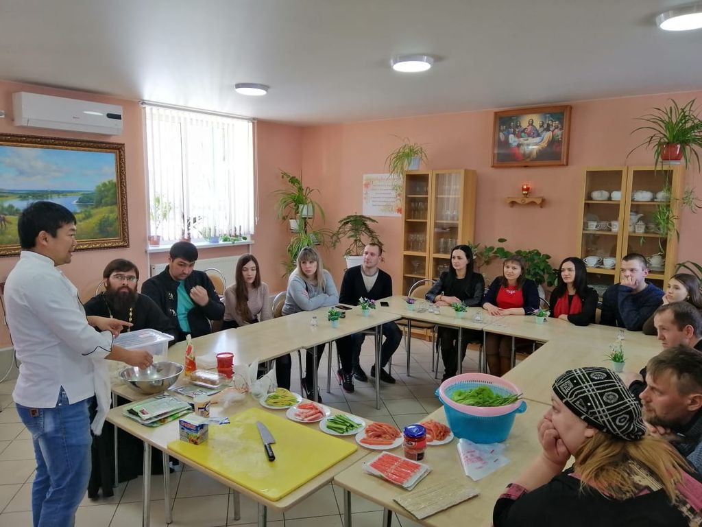 Очень необычная встреча прошла в трапезной Покровского кафедрального собора г. Шахты. Настоятель собора иерей Александр Теличкин представил собравшимся Владислава Угай – шеф-повара японской кухни и главного тренера отделения спортивного клуба по тхэквондо «Грандмастер» г. Каменск-Шахтинский. Гость провел мастер-класс по изготовлению суши.