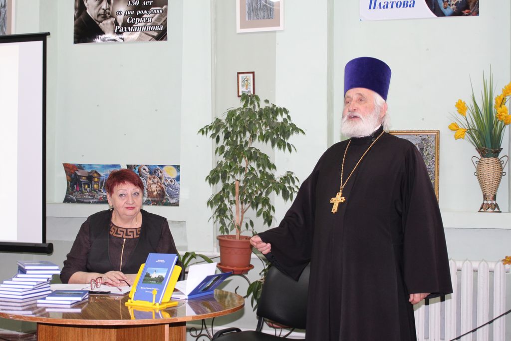Модератором площадки выступила ведущий библиотекарь отдела массовой работы ЦГБ им. А. С. Пушкина Татьяна Петровна Листопадова. О истории и духовном значении творчества отца Николая собравшимся рассказал древлехранитель Шахтинской епархии, секретарь Ростовского отделения Императорского Православного Палестинского Общества Илья Геннадиевич Шарков, написавший вступительное слово к презентуемому сборнику. Епархиальный древлехранитель отметил, что поэтическое творчество уважаемого священника и пламенного патриота Дона и России обращено ко всем людям, ценящим русское слово, ищущим подлинную Красоту и стремящимся к непреходящей Истине. Духовная поэзия – это особый жанр, в котором выявляется чистота тона, где недопустима фальшь и где автор не сможет укрыться за искусной игрой рифм, вязью слов и яркостью метафор. Стихи этого жанра не пытаются играть на чувствах читателя, пробуждая в нём страсти, а доходят до сердца читателя, понуждают его сверить свой духовный путь с теми, кто достиг святости, заставляют ощутить сопричастность к святой Руси и её идеалам. Своим творчеством поэт пытается мостить дорогу, ведущую к вершинам Духа и вести по ней своего читателя. Правдиво высекая каждое берущее за душу слово, автор открывает богатый мир очищенной Богом отечественной речи. Как пастырь, отец Николай направляет свой поэтический дар к спасению словесной паствы. Служение Алтарю у автора тесно связано со служением поэтическому слову. Поэт Духа склоняется перед Словом и смиренно приносит к Его подножию все свои таланты и умения. Поэзия отца Николая при кажущейся сдержанности несёт свет, озарение Правды, евангельскую радость, святоотеческую глубину смыслов, и помогает дерзновенно приоткрывать Божий мир в его прикровенных образах и честно рассматривать человеческий мир в его разных красках.