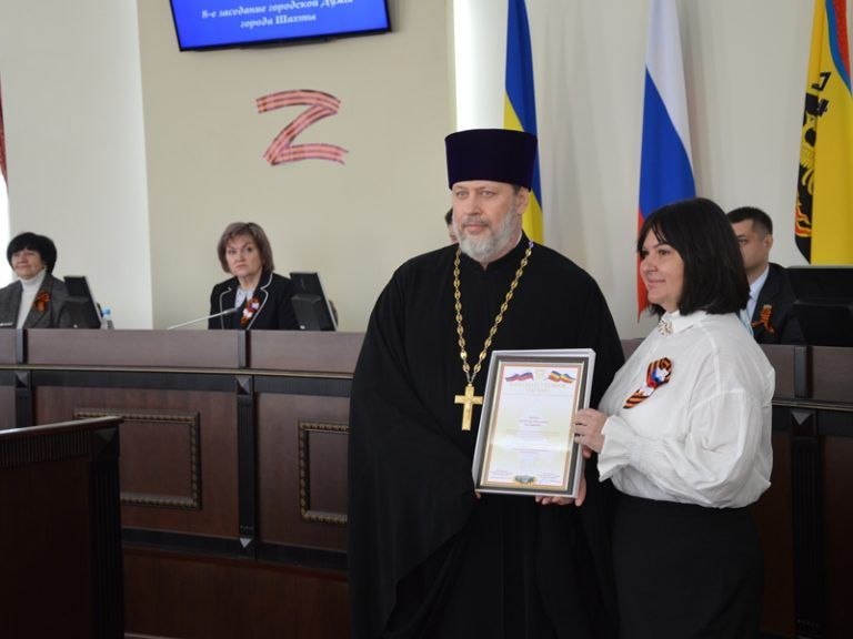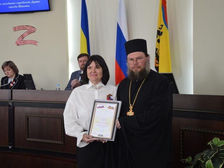 По поручению А.В. Ищенко Ирина Анатольевна Жукова вручила награды – благодарственные письма Законодательного Собрания Ростовской области за значительный личный вклад в формирование и реализацию социально-экономической политики, активное участие в общественно-политическом развитии Ростовской области протоиерею Александру Игоревичу Маликову – руководителю молодежного отдела Шахтинской епархии, настоятелю храма великомученицы Параскевы станицы Манычской Багаевского района Ростовской области, а также иерею Владиславу Евгеньевичу Касьянову – руководителю отдела по церковной благотворительности и социальному служению Шахтинской епархии, настоятелю храма Пресвятой Богородицы города Каменск-Шахтинский.