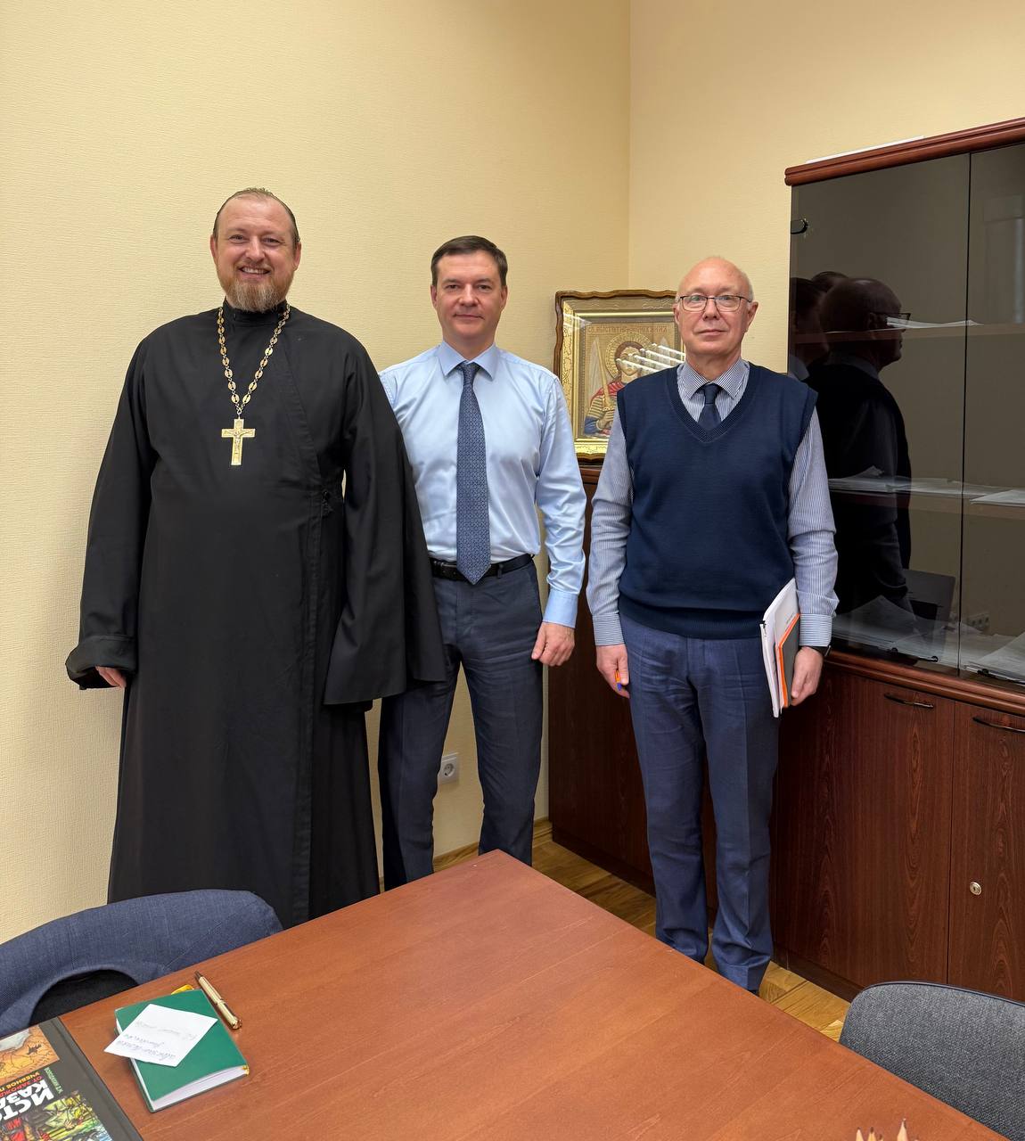 20 февраля 2026 года в рамках работы епархиального отдела по взаимодействию с казачеством Шахтинской епархии состоялась встреча его руководителя, настоятеля Донского храма города Новошахтинска протоиерея Романа Амплеева, с директором департамента по делам казачества и кадетских учебных заведений Ростовской области Сергеем Владимировичем Красавиным и его заместителем – начальником отдела Александром Викторовичем Лазаревым.