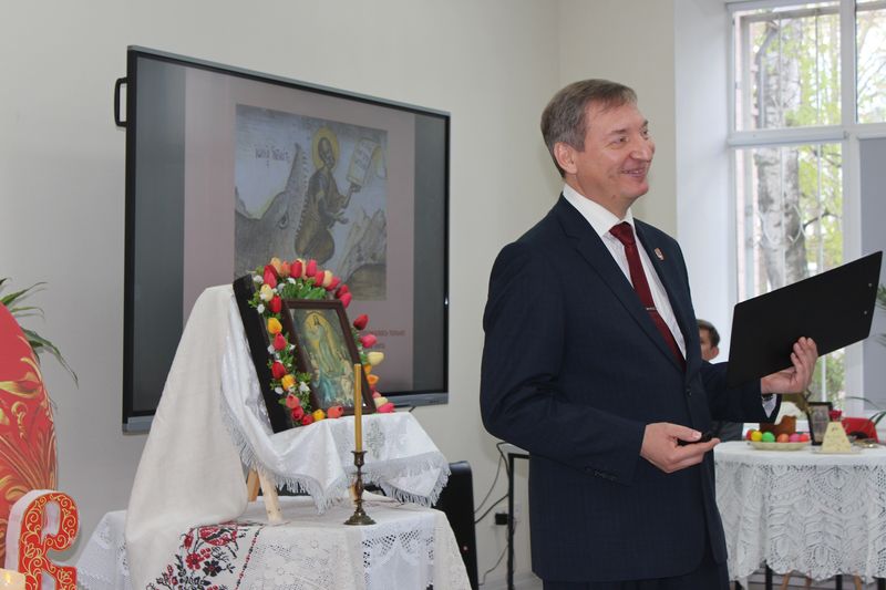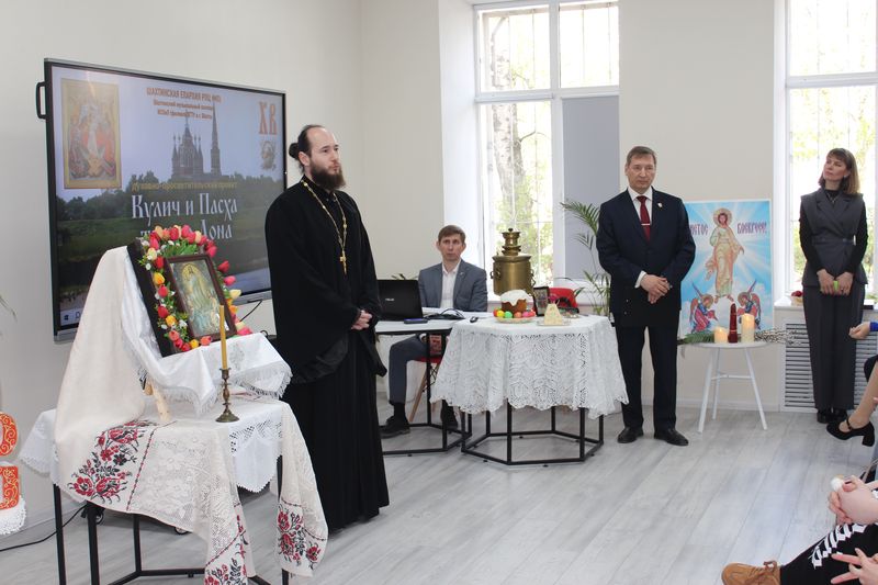 Зал, в котором проводилось мероприятие, был празднично украшен студентами, участниками студенческого научного кружка «Православный Восток» и преподавателями. Вниманию собравшихся были представлены выставки евлогий Святой Земли, рассказывающие о пасхальных торжествах в Иерусалиме в конце XIX – начале XX вв., предметов казачьего быта и атрибутов казачьего пасхального чаепития последней четверти XIX столетия. А также выставка пасхальных открыток и конкурсная выставка пасхальных композиций, инсталляций и кулинарных сюрпризов. Вниманию участников форума был представлен подготовленный при поддержке декана факультета «Техника и технологии» Дмитрия Викторовича Руслякова тематический баннер, рассказывающий о жизни и служении донского святого, члена-сотрудника Императорского Православного Палестинского Общества, ростовского протоиерея Иоанна Домовского. Об отце Иоанне рассказал собравшимся Илья Геннадиевич Шарков, отметив, что информация о членстве в Палестинском Обществе новопрославленного святого вошла в его житие благодаря вышедшей в 2022 году монографии И.Г. Шаркова и Л.Б. Томилиной «Донской и Екатеринославский отделы Императорского Православного Палестинского Общества в конце XIX – начале XX веков: социокультурная и просветительская деятельность на Юге Российской империи». Илья Геннадиевич также отметил, что праведный священник скончался во время Великого поста в 1930 году, незадолго перед кончиной съел варёное яйцо, символически отметив, что Пасху он будет встречать уже не на земле, а в Горнем мире. При обретении его честных мощей в руках у праведника было обнаружено пасхальное яйцо.
