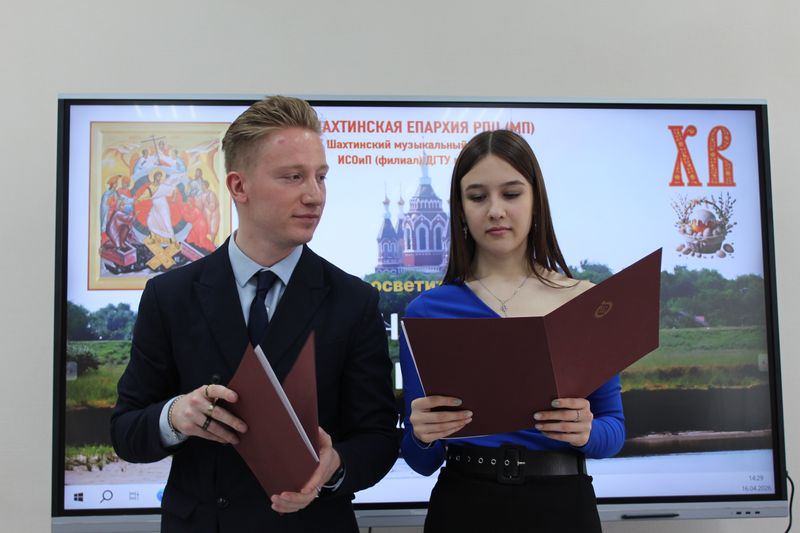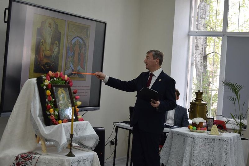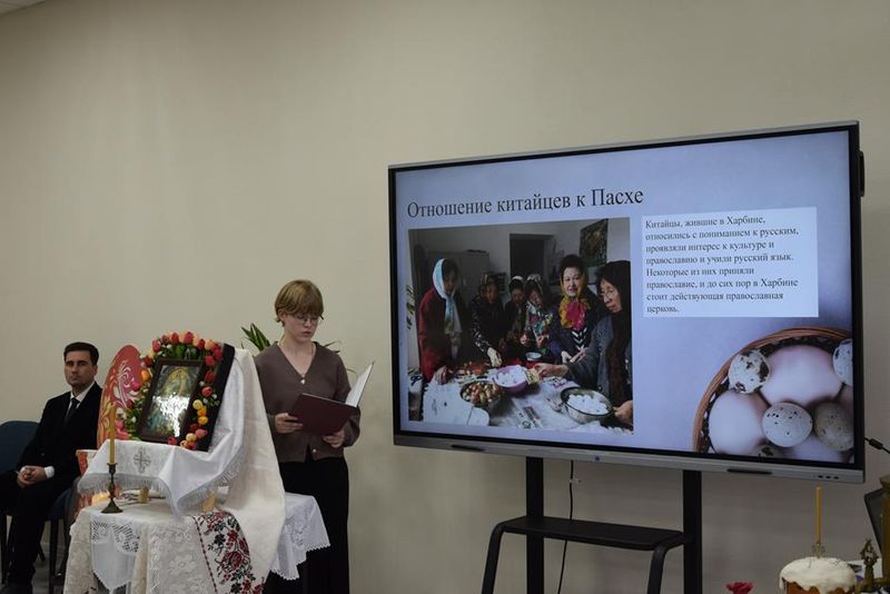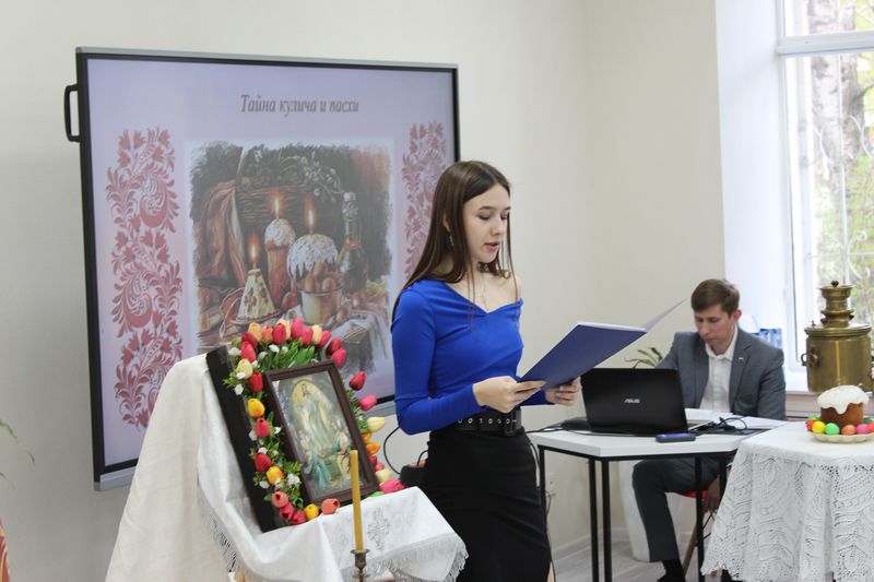 Собравшиеся ознакомились с иконографией Воскресения Христова, библейской основой и особенностями сюжетов и композиций, историей школ русского, византийского и западноевропейского церковного искусства. Узнали много нового о кулинарной истории Пасхи Христовой, символах, обрядах и непременных атрибутах хлебосольных застолий на казачьем Дону, а также в среде русских эмигрантов в китайском Харбине в 1920–1940 годах и пасхальной теме в творчестве Ивана Бунина. Выступления старшего преподавателя И.Г. Шаркова, студентов научного кружка «Православный Восток» Владислава Семерникова, Виктории Филоненко, Оксаны Войновой и Георгия Колбина сопровождались яркими и содержательными презентациями. В зале звучали строки стихов Ивана Бунина, протоиерея Николая Уварова и Сергея Грешникова, воспевающих светлое Пасхальное торжество. Стихи читали студенты музыкального колледжа Арина Абашина и Полина Гайдукович (руководитель преподаватель Ольга Михайловна Ашнина) и студент ИСОиП Георгий Колбин (руководитель старший преподаватель Илья Геннадиевич Шарков).